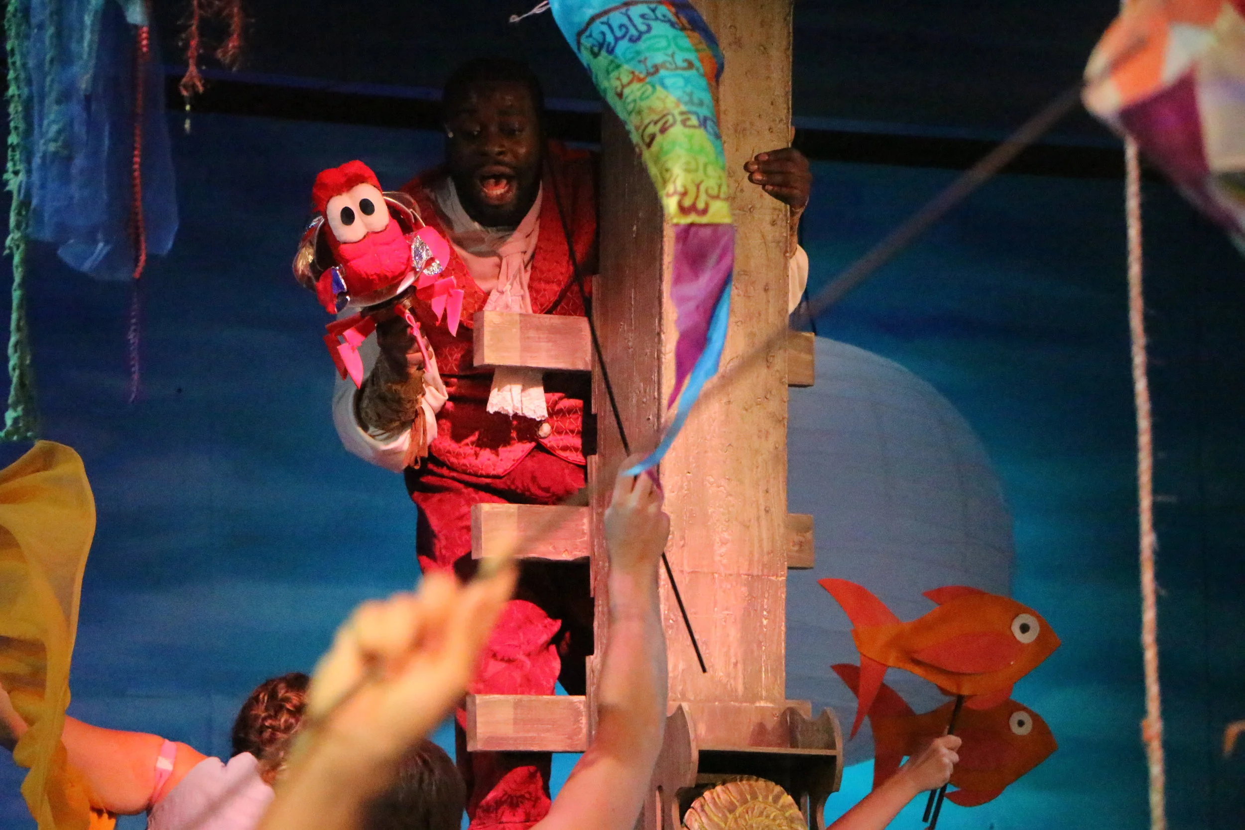 Another prominent aspect of this show was our highly theatrical solutions to difficult and complex sequences, such as The Storm and The Transformation, relying more on physical theatre techniques rather than expensive and out of reach special effects. Another theatrical solution we employed was a thorough use of inventive puppetry not only with main characters (Sebastian, Flounder) but also with general sea creature puppets dancing through Under The Sea and inanimate objects (like ocean waves and Ursula's tentacles) having a life of their own.