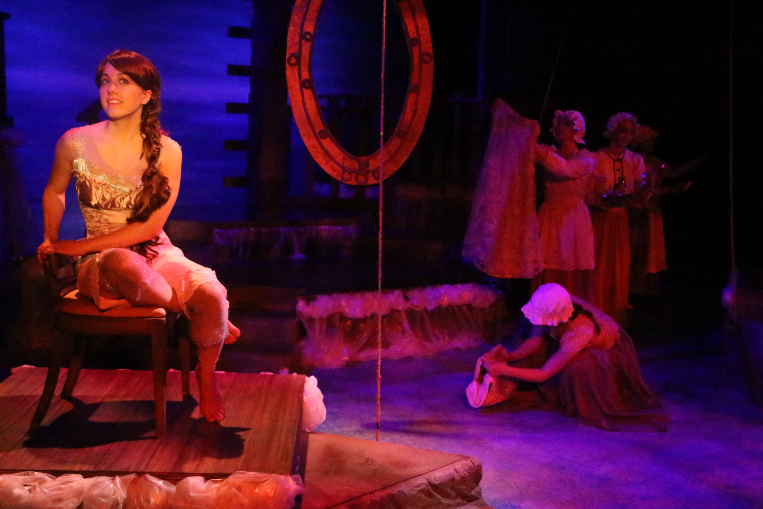 We talked a lot about emphasizing the vertical space in the room, as opposed to topography on the stage surface, in order to build the three dimensional dynamic of the ocean. This is where the asymmetrical platforms and the ropes bisecting the space came from. Different set pieces were hoisted up and down throughout highly choreographed and fluid transitions that continually brought the audience's eyes upward. We also spent time discussing how to envision a mermaid tail. We realized that placing a literal rendition of a tail on an actress would only inhibit her, when in Ariel's world her tail underwater gives her ultimate agility and ease. The analogy to the land, of course, is feet. So we worked with the conceptual idea of Ariel's mobility underwater being represented by flowy pants and slippers that enable our actress to really fly around the space contrasting with Ariel's (and really every woman's) relative restriction on the land with high heels, corsets, and heavy draping layers of skirts and petticoats to create the paradox of being bound both underwater and on land.